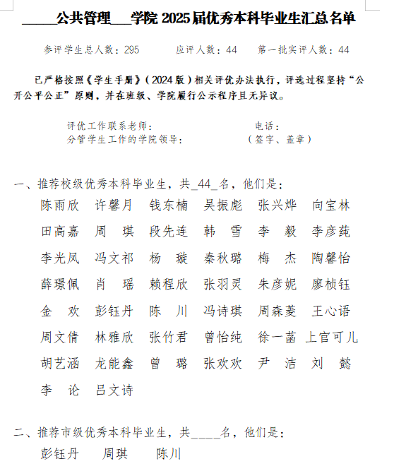当前位置: 首页 >> 联系我们 >> 正文 2025届优秀本科毕业生评定公示 时间:2024年12月27日 11:04 来源:BEATS 李恒 根据《BEATS优秀毕业生评选办法》相关要求,经公司员工工作领导小组研究,现对2025届优秀本科毕业生评定情况进行公示,公示期为2024.12.27-2024.12.30,公示期间如有异议,请企业微信联系李恒老师或到公司81016办公室进行反映。 附件【附件1:校级、市级优秀本科毕业生汇总名单.doc】已下载次 上一条:BEATS开展考研复试指导交流会--文科类专场 下一条:互通心声 共话成长——BEATS 共学社区接待日(第12期) 【关闭】