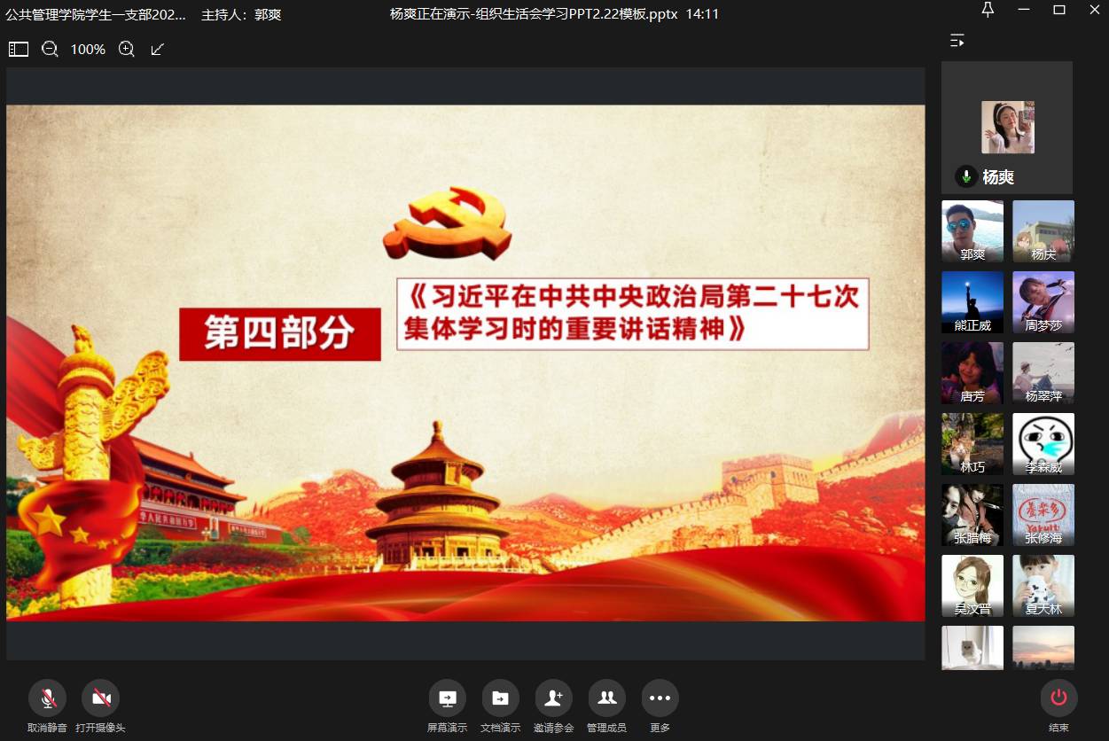 当前位置: 首页 >> 党建双创 >> 主题党日活动 >> 正文 BEATS员工一支部 2021年2月组织生活会顺利召开 时间:2021年02月26日 13:02 来源:BEATS 周梦莎 2021年2月24日14点30分,BEATS员工一支部在企业微信召开了二月线上组织生活会。此次会议由员工一支部书记郭爽同志主持,全体党员同志参加。 此次会议由曹国睿、杨爽、吴汶晋、杨庆、周梦莎五位党员同志领学相关文件。其中曹国睿同志分享了习近平在省部级主要领导干部学习贯彻党的十九届五中全会精神专题研讨班开班式上的重要讲话、习近平在十九届中央纪委五次全会上的重要讲话精神、习近平在世界经济论坛“达沃斯议程”对话会上的特别致辞;杨爽同志领学了习近平在中共中央政治局第二十七次集体学习时的重要讲话精神、《中国共产党党员权利保障条例》、《中国共产党统一战线工作条例》;吴汶晋同志分享了中国共产党第十九届中央纪律检查委员会第五次全体会议公报、重庆市第五届人民代表大会第四次会议决议、中国人民政治协商会议重庆市第五届委员会第四次会议决议;杨庆同志领学了重庆市人民政府工作报告;周梦莎同志领学了2021年全国教育工作会议精神、教育部等六部门关于加强新时代高校教师队伍建设改革的指导意见。领学结束后,支部书记郭爽同志进行总结谈到马上就要开学,按照教育部的指示开学后要进行封闭管理,党员同志要向班级同学做好传达工作,起好带头作用,大三、大二的同学要做好发展新党员的前期准备工作,了解好新发展同志的情况。 假期已经过去,相信党员同志们能够迅速调整好状态,投入到新学期的学习和工作中,严格遵守公司防疫要求做好疫情防范工作,做好班级同学学习的榜样。 BEATS员工一支部2021年2月线上组织生活会 上一条:BEATS员工一支部 2020年民主评议及2021年3月组织生活会顺利召开 下一条:BEATS员工一支部 2021年1月组织生活会顺利召开 【关闭】