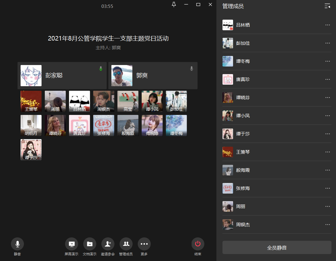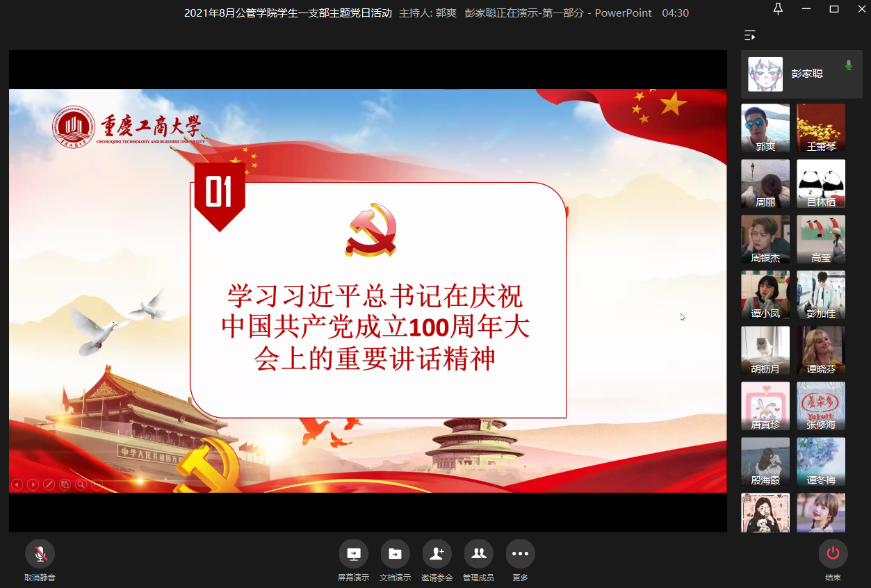 当前位置: 首页 >> 党建双创 >> 主题党日活动 >> 正文 BEATS员工一支部2021年8月主题党日活动顺利召开 时间:2021年08月21日 09:53 来源:BEATS 郭爽 2021年8月20日15时,BEATS员工一支部在企业微信召开了线上八月主题党日活动。此次会议由员工一党支部书记郭爽同志主持,一支部全体党员同志参加。 会议主要是由彭家聪、谭冬梅、唐真珍、吕林栖四位同志领学相关文件。其中,彭家聪同志领学了《学习习近平总书记在庆祝中国共产党成立100周年大会上的重要讲话精神》、《习近平在西藏考察时的重要讲话精神》;谭冬梅同志领学了习近平在亚太经合组织领导人非正式会议上的讲话——《团结合作抗疫,引领经济复苏》、习近平在中国共产党与世界政党领导人峰会上的主旨讲话——《加强政党合作,共谋人民幸福》;唐真珍同志领学了党史的相关内容,包括了习近平总书记讲话、指示中有关学史明理、学史增信、学史崇德、学史力行内容的节录、为百年大党千秋伟业提供坚强保证——中国共产党组织建设的辉煌成就与宝贵经验、中组部召开抓党建促乡村振兴电视电话会议精神等三部分的内容;吕林栖同志领学了《关于在防汛救灾中充分发挥基层党组织战斗堡垒作用和广大党员先锋模范作用通知》、《向王红旭同志学习的通知》。 领学结束后,支部书记郭爽同志谈到河南洪灾和国内新冠肺炎疫情反弹,作为党员同志,应该积极发挥党员的先锋模范作用,积极给身边同学提供帮助,携手度过难关,同时,郭爽同志提到马上新学期要开学了,各位党员同志应该积极主动帮助班委督促班上同学按时返校并遵守公司相关疫情防疫及其他规定。 通过此次主题党日活动,党员同志们进一步了解了党近期的系列动态,更加深入学习党史,学习先进精神,更加自觉的树立起党员的先锋模范作用。 上一条:BEATS员工第二党支部2021年9月组织生活顺利举行 下一条:BEATS员工二支部2021年8月主题党日活动顺利召开 【关闭】