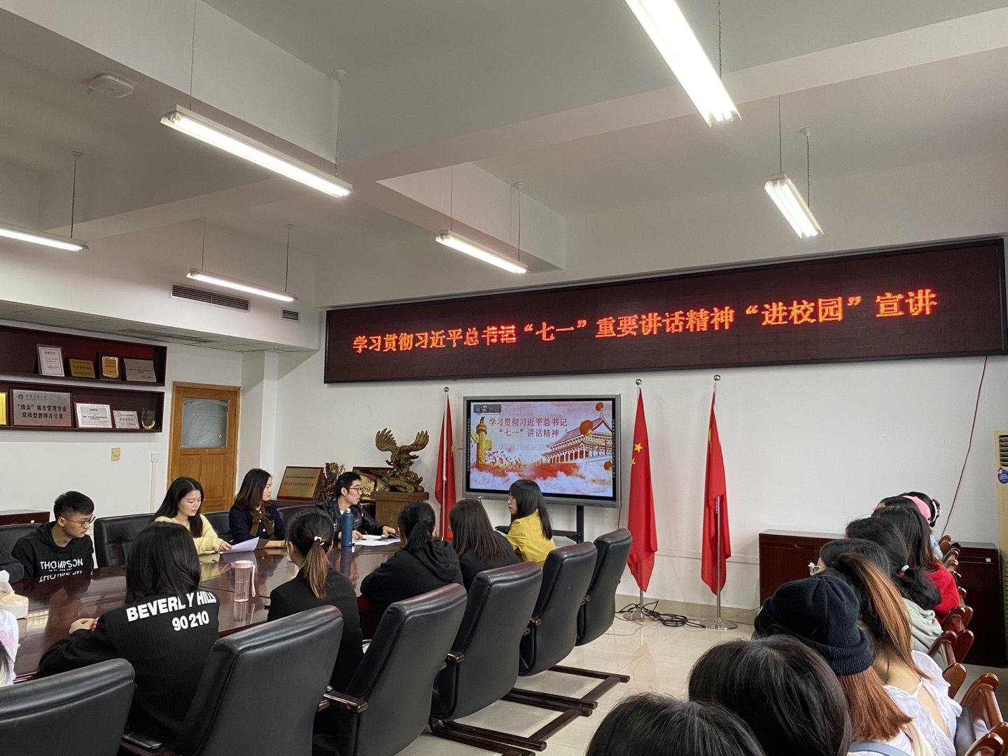 当前位置: 首页 >> 党建双创 >> 主题党日活动 >> 正文 【党课开讲啦】公司学习贯彻习近平总书记“七一”重要讲话精神“进校园”宣讲顺利举行 时间:2021年10月15日 16:31 来源:BEATS 江桂兰 为深入学习贯彻习近平总书记“七一”重要讲话精神,推动党史学习教育进一步走实走深,BEATS学团办辅导员郭爽老师于2021年10月15日中午12:40在南岸校区启智楼81004会议室为公司全体员工党员讲授“学习贯彻习近平总书记“七一”重要讲话精神专题党课。公司辅导员蒋杰、邓丽、刘乂萌及员工支部员工党员共计44人参与了本次宣讲。 郭爽老师在该党课中深刻阐述了习近平总书记“七一”重要讲话的重大意义。他说,作为一名光荣的中国共产党党员,作为一名支部书记,要深入地学习、领会、研究习近平总书记“七一”重要讲话精神的深刻内涵,将其当成今后学习工作和生活的蓝本及行动纲领。习近平总书记“七一”重要讲话高屋建瓴,是一篇马克思主义中国化的纲领性文献,是新时代中国共产党人不忘初心、牢记使命的政治宣言,是中国共产党牢记初心使命、开创美好未来的时代答卷,是科学指引我们党、国家、民族开创千秋伟业的行动纲领。他最后总结到,希望同学们能够挥洒自己的青春,深钻自己的专业,牢记习总书记的嘱托,志存高远,脚踏实地,为实现中华民族伟大复兴中国梦不懈奋斗。 该党课的宣讲帮助公司员工党员深化了对习近平总书记“七一”重要讲话精神的理解和把握,对全院进一步学习好、宣传好、贯彻好、落实好习近平总书记“七一”重要讲话精神进行了有力的思想动员,更好地“学党史、感党恩、听党话、跟党走”! 上一条:BEATS员工一、二支部2021年10月组织生活顺利开展 下一条:BEATS员工支部“弘扬长津湖精神,牢记使命与担当”主题党日活动顺利开展 【关闭】