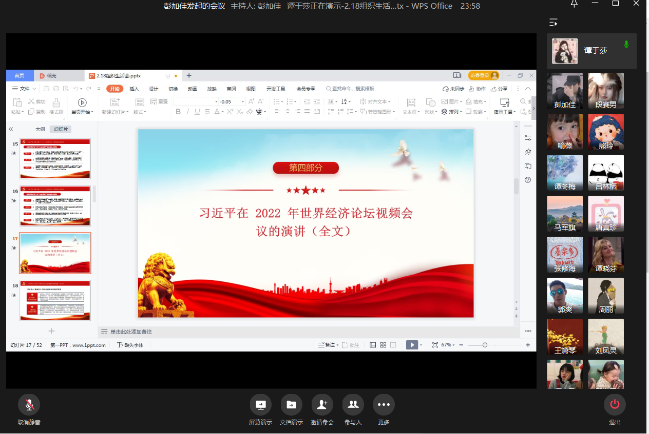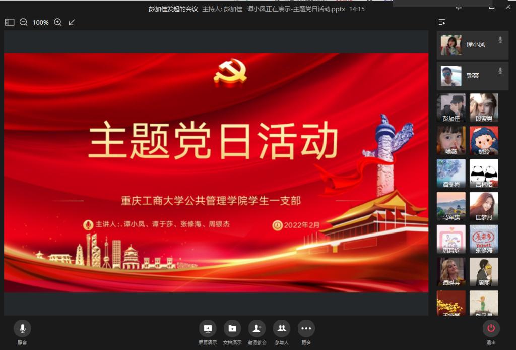 当前位置: 首页 >> 党建双创 >> 主题党日活动 >> 正文 BEATS员工一支部2022年2月主题党日活动顺利召开 时间:2022年02月21日 09:32 来源:BEATS 郭爽 2022年2月18日15时,BEATS员工一支部在企业微信召开2月主题党日活动。员工一支部全体党员同志均准时参会。会议还邀请了教工一支部马军旗老师和部分发展对象及积极分子参加。 本次主题党日活动由谭小凤、谭于莎、周银杰、张修海同志领学2月组织生活会的相关文件。其中,谭小凤同志领学了《学习贯彻党的十九届六中全会精神专题研讨班开班式上的重要讲话精神》、《习近平在十九届中央纪委六次全会上的重要讲话精神》、《习近平:不断做强做优做大我国数字经济》;谭于莎同志领学了《习近平在2022年世界经济论坛视频会议的演讲(全文)》、《习近平在十九届中共中央政治局第三十六次集体学习会议上的讲话精神》、《习近平在中国同中亚五国建交30周年视频峰会上的讲话(全文)》;周银杰同志领学了《中国共产党第十九届中央纪律检查委员会第六次全体会议公报》、《1月24日中共中央政治局会议精神》、《2022年全国教育工作会议精神》;张修海同志领学了《全市党史学习教育总结会议精神》、《中国共产党重庆市第五届纪律检查委员会第六次全体会议决议》、《市委常委会传达学习贯彻习近平总书记在十九届中央纪委六次全会上的重要讲话精神》、《陈敏尔:坚定信心、凝聚共识、勇毅前行、为推动高质量发展贡献智慧力量》等内容。 领学结束后大家进行了激烈的讨论。其中,王箫琴同志说到:“当前我国处于高速发展的阶段,其中大数据,云技术越发重要,关注数字经济的发展,推动数字经济的发展尤为重要。”任瑶同志说到自己的看法:“今年是我国进入全面建设社会主义现代化国家,向第二个百年奋斗目标进军的重要一年,在这样特殊的一年里,作为青年老员工,增强“四个意识”、坚定“四个自信”、做到“两个维护”是对我们基本的要求。” 最后支部书记郭爽同志总结发言:“第一,对于党史的学习,不管是党员、预备党员、发展对象还是入党积极分子有应该每天保持学习,不断提高自己的理论储备,提高理论修养;第二,在即将开学之际,大家要按照公司的要求进行防疫,做好返校准备,不去中高风险地区,及时上报行程,做好核酸,及时返校。” 上一条:BEATS员工一支部2021年度基层党组织组织生活会和民主评议顺利召开 下一条:BEATS员工一支部2022年1月主题党日活动顺利召开 【关闭】