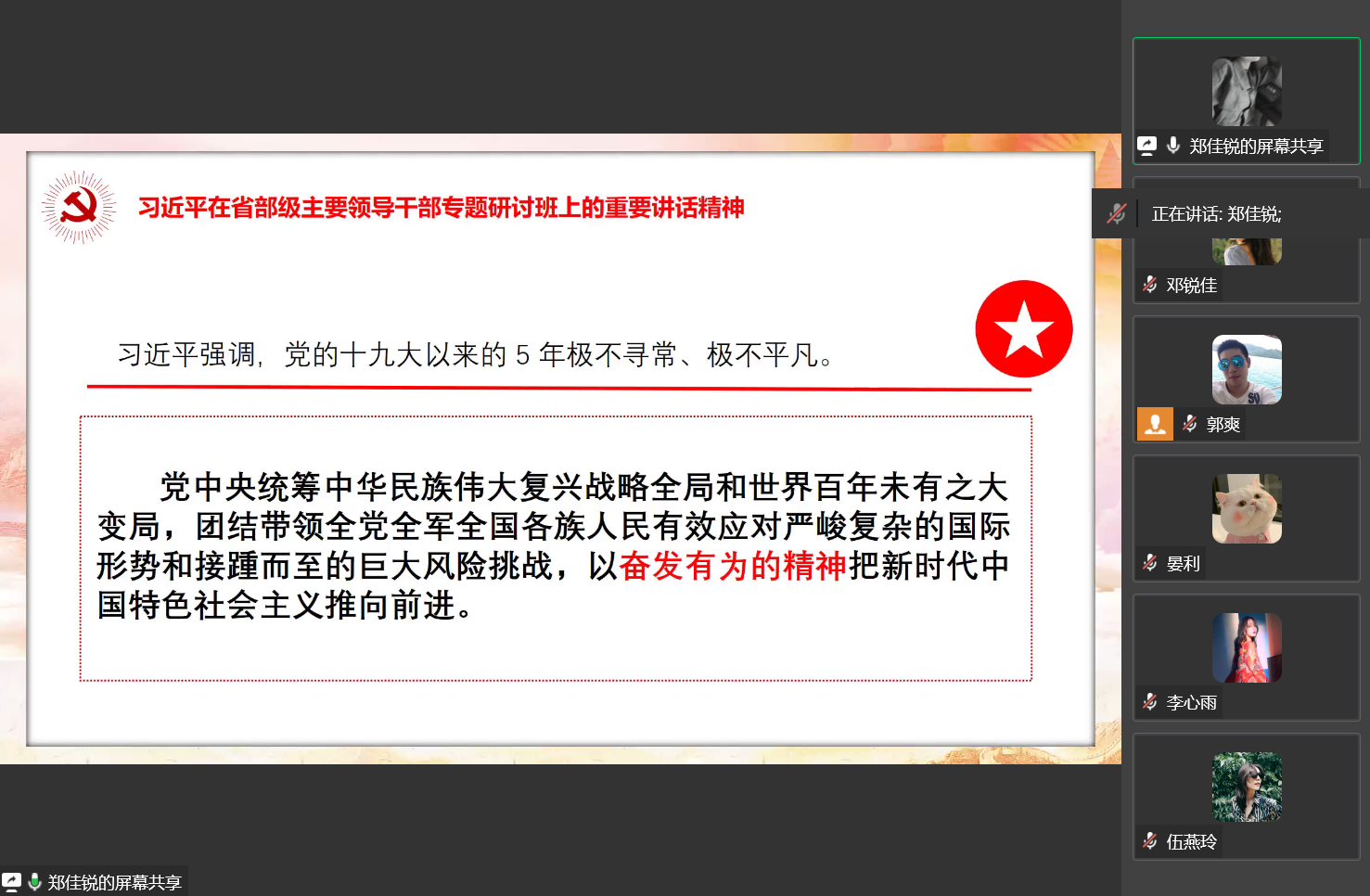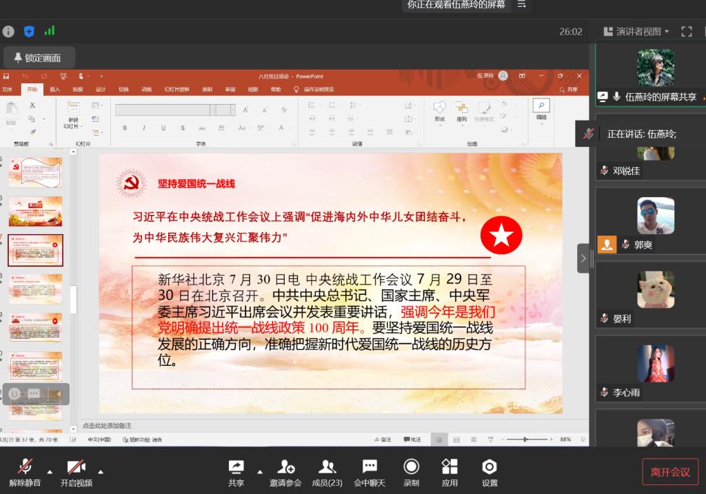 当前位置: 首页 >> 党建双创 >> 主题党日活动 >> 正文 BEATS员工第一党支部召开8月份主题党日活动 时间:2022年08月19日 16:40 来源:BEATS 郭爽 2022年8月19日,BEATS员工第一党支部在线上企业微信召开月8主题党日活动,本次活动应到23人,实到23人,本次活动由支部书记郭爽主持。 会议伊始,首先是由2020级郑佳锐、罗阳、伍燕玲、邓锐佳四位党员同志领学8月相关学习内容。其中郑佳锐同志领学了关于《习近平在新疆考察时的重要讲话精神》、《习近平向世界青年发展论坛致贺信》、《习近平在省部级主要领导干部专题研讨班上的重要讲话精神》的内容,她指出各国青年要弘扬和平、发展、公平、正义、民主、自由的全人类共同价值,以实际行动推进全球发展倡议,助力落实联合国2030年可持续发展议程,共同谱写世界青年团结合作的时代新篇章。罗阳同志领学了关于《习近平主持中共中央政治局7月28日会议》、《习近平在党外人士座谈会上的重要讲话精神》、《习近平向中国共产党与世界马克思主义政党论坛致贺信》的内容,她指出只要贯彻落实好中共中央决策部署,准确识变、科学应变、主动求变,就一定能够抓住历史机遇、赢得发展先机。伍燕玲同志领学了关于《习近平在中央统战工作会议上的重要讲话精神》、《习近平总书记重要文章《把中国文明历史研究引向深入, 增强历史自觉坚定文化自信》》、《习近平总书记重要文章《在庆祝中国人民解放军建军90周年大会上的讲话》》的内容,她指出我们要坚持以新时代中国特色社会主义思想为指导,坚持中国共产党领导,坚持中国特色社会主义道路,高举爱国主义、社会主义伟大旗帜,坚持一致性和多样性统一。邓锐佳同志领学了关于《《习近平生态文明思想学习纲要》出版发行》、《中共中央办公厅转发《中央宣传部、中央组织部关于认真组织学习〈习近平谈治国理政〉第四卷的通知》》、《市委常委会7月19日会议精神(部署学习宣传贯彻《习近平谈治国理政》第四卷等工作)》、《《习近平谈治国理政》第一卷至第三卷(电子版)》的内容,她指出我们深切缅怀为中国人民解放事业和社会主义建设事业而英勇献身的人民军队革命烈士们,他们的牺牲奉献,永远铭记在中国人民心中。领学完毕后,与会党员同志展开了讨论。杨若欣同志说:“作为新时代新青年,应做到全面系统学、及时跟进学、深入思考学、联系实际学,坚持不懈用习近平新时代中国特色社会主义思想武装头脑、指导实践、推动工作,自觉做习近平生态文明思想的坚定信仰者和忠实践行者。”李心雨同志说:“青年代表希望,青年创造明天。中国始终把青年看作推动社会发展的有生力量,我们也要不负祖国的期望,为祖国的建设添砖加瓦。” 讨论后,支部书记郭爽同志作了总结讲话。他提醒党员同志们要加强疫情防范意识,做好防护工作。开学在即,希望各位党员同志能够做好表率,同时积极引导班级其他同学,有序返校。同时,他对党员同志提出殷切希望,希望各位党员同志能够把握住机会,针对自己的实际情况,做出切实的人生规划并为之努力奋斗。 上一条:BEATS员工第一党支部召开2022年9月主题党日活动 下一条:BEATS员工第一党支部召开2022年7月主题党日活动 【关闭】