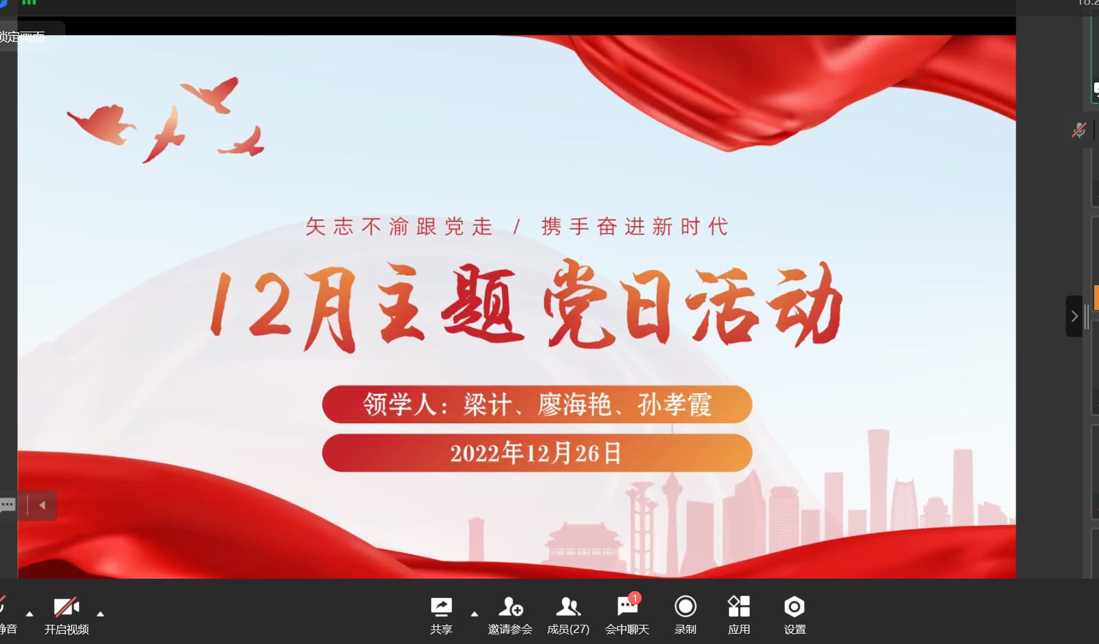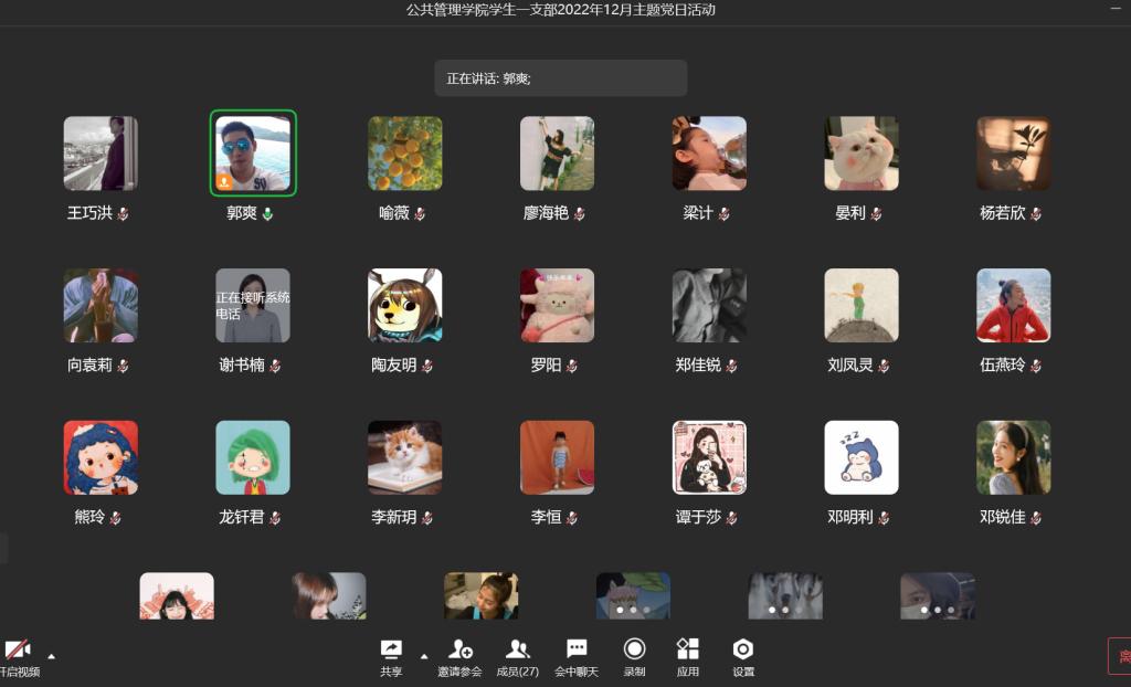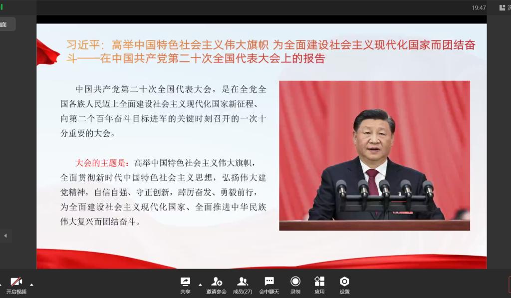 当前位置: 首页 >> 党建双创 >> 主题党日活动 >> 正文 BEATS员工第一党支部召开2022年12月主题党日活动 时间:2022年12月26日 17:23 来源:BEATS 郭爽 2022年12月26日,BEATS员工第一党支部在企业微信召开2022年12月主题党日活动,本次活动应到27人,实到27人,本次会议由支部书记郭爽同志主持。 会议伊始,首先是由2020级梁计、廖海艳、孙孝霞三位党员同志领学12月相关学习内容。其中,梁计同志领学了《习近平:高举中国特色社会主义伟大旗帜 为全面建设社会主义现代化国家而团结奋斗——在中国共产党第二十次全国代表大会上的报告》、《中国共产党第二十次全国代表大会关于十九届中央委员会报告的决议》、《中国共产党章程(中国共产党第二十次全国代表大会部分修改,2022 年 10 月 22 日通过)》、《中国共产党第二十次全国代表大会关于《中国共产党章程(修正案)》的决议》的内容,廖海艳同志领学了《十九届中央纪律检查委员会向中国共产党第二十次全国 代表大会的工作报告》、《中国共产党第二十次全国代表大会关于十九届中央纪律 检查委员会工作报告的决议》、《习近平在第五届中国国际进口博览会开幕式上的致辞》、《习近平在《湿地公约》第十四届缔约方大会开幕式上的致辞》的内容,孙孝霞同志领学了《中共中央政治局常务委员会 11 月 10 日会议精神》、《习近平在二十国集团领导人第十七次峰会第一阶段会议上的讲话》、《习近平在党的十九届七中全会第二次全体会议上的讲话》的内容。领学完毕后,与会党员同志展开了讨论。晏利同志说我们要坚持以习近平同志为核心的党中央的领导,高举中国特色社会主义伟大旗帜,弘扬伟大建党精神,增强“四个意识”坚定“四个自信”做到“两个维护”。熊玲同志说我们的党员、干部,不论在职还是从工作岗位上退下来了,无论在什么时候、什么地方、什么场合,都要始终牢记自己是一名共产党员,都要始终发挥先锋模范作用,都要始终坚持和维护党的领导、维护党的团结统一。 讨论后,支部书记郭爽同志作了讲话。首先,他向在座的党员同志讲述了江泽民同志伟大光辉的一生,我们缅怀江泽民同志,就是要牢记他的殷切希望,要在以习近平同志为核心的党中央坚强领导下,踔厉奋发、勇毅前行,以更辉煌的业绩告慰江泽民同志。其次,他也提醒大四的党员同志要利用好寒假时间努力寻找工作,并且着手毕业论文的事情,在不断学习中提升自己。 上一条:BEATS员工第一党支开展2023年1月份主题党日活动 下一条:【学习党的二十大精神】“学习党的二十大精神,立志做新时代好青年”知识竞赛圆满结束 【关闭】