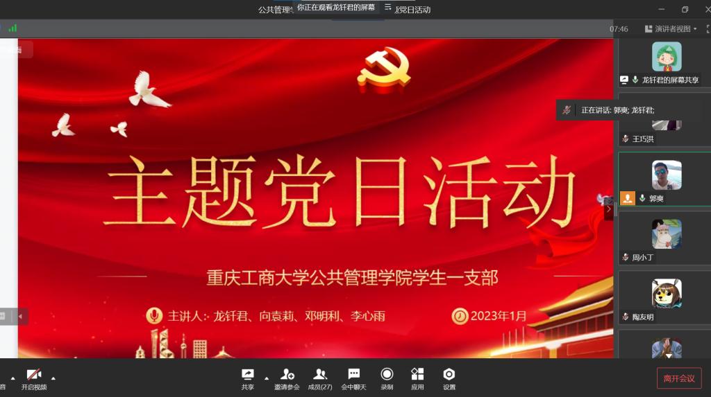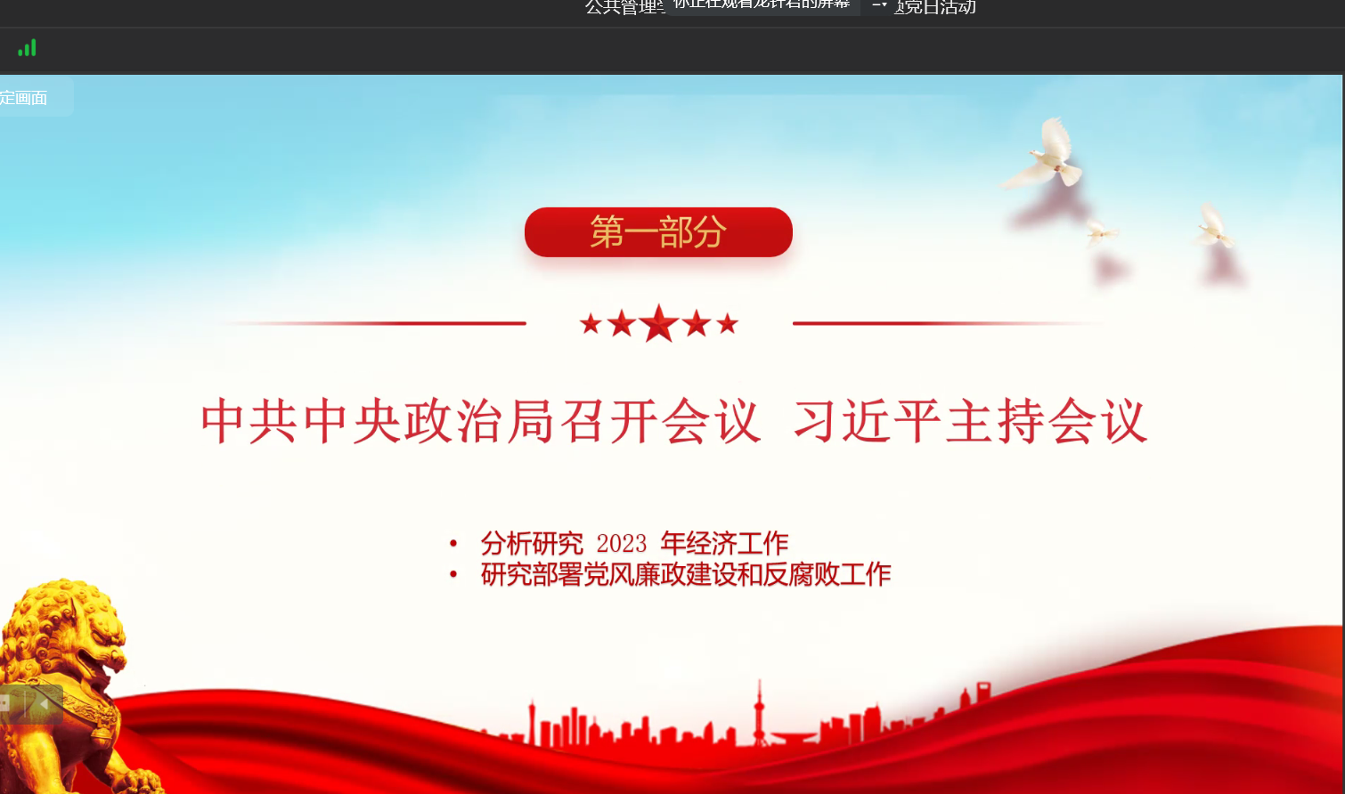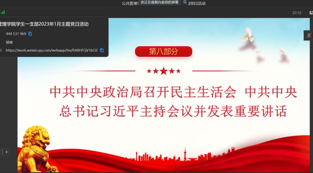 当前位置: 首页 >> 党建双创 >> 主题党日活动 >> 正文 BEATS员工第一党支开展2023年1月份主题党日活动 时间:2023年01月13日 17:54 来源:BEATS 郭爽 BEATS员工第一党支开展2023年1月份主题党日活动 2023年1月13日,BEATS员工第一党支部在企业微信以集中学习的方式开展了主题党日活动,本次活动应到27人,实到27人,本次活动由支部书记郭爽同志主持。 会议伊始,首先是由2019级龙钎君、向袁莉、邓明利、李心雨四位党员同志领学1月相关学习内容。其中,龙钎君同志领学了《中共中央政治局12月6日会议精神分析研究2023年经济工作研究部署党风廉政建设和反腐败工作》、《习近平在中共中央12月2日党外人士座谈会上的重要讲话精神》、《习近平总书记重要文章《继承和发扬党的优良革命传统和作风弘扬延安精神》(《求是》2022年第24期)、《习近平在《生物多样性公约》第十五次缔约方大会第二阶段高级别会议开幕式上的致辞》、《习近平在12月15日至16日中央经济工作会议上的重要讲话精神》的内容,向袁莉同志领学了《习近平总书记重要文章《谱写新时代中国宪法实践新篇章——纪念现行宪法公布施行40周年》》、《习近平在12月23日至24日中央农村工作会议上的重要讲话精神》、《习近平在中共中央政治局12月26日至27日民主生活会上的重要讲话精神》的内容,邓明利同志领学了《习近平在全国政协新年茶话会上的讲话》、《国家主席习近平发表二〇二三年新年贺词》、《习近平总书记重要文章《为实现党的二十大确定的目标任务而团结奋斗》》、《市委常委会12月9日会议精神学习贯彻习近平总书记重要讲话精神坚决维护党中央集中统一领导》的内容,李心雨同志领学了《市委六届二次全会会议精神 全面学习宣传贯彻党的二十大精神在新时代新征程为建设社会主义现代化新重庆而团结奋斗》、《市委常委会12月23日会议精神传达学习习近平总书记重要指示精神把全面实施宪法工作提高到新水平》、《市委理论学习中心组(扩大)1月3日深入学习贯彻党的二十大精神专题学习会议精神》的内容。 随后由陶友明同志分享了焦裕禄的藤椅的故事。焦裕禄以“生也沙丘,死也沙丘,父老生死系”的赤诚,以“心中装着全体人民、唯独没有他自己”的公仆情怀,诠释着亲民爱民、艰苦奋斗、科学求实、迎难而上、无私奉献的焦裕禄精神。焦裕禄去世了,但焦裕禄精神仍在延续。 所有领学完毕后,与会同志展开讨论。郑佳锐同志说,要落实产业帮扶政策,推动乡村产业全链条升级,增强市场竞争力和可持续发展能力。巩固拓展脱贫攻坚成果是全面推进乡村振兴的底线任务,要继续压紧压实责任,把脱贫人口和脱贫地区的帮扶政策衔接好、措施落到位,坚决防止出现整村整乡返贫现象。伍燕玲同志说同志要带头强化系统观念,提高政治站位,学习落实好党的方针政策。 最后,郭爽同志对自身一年来支部书记工作作了小结,对支部工作提出新要求,他提出在今后将会组织策划更多的支部活动,加强宣传与引导,吸引更多优秀的人才加入党支部,壮大支部人才队伍。在总结讲话中,他谈到新时代新征程我们应该树立新的目标,做德智体美劳全面发展的人,建设优秀的员工党支部,为公司公司发展做贡献。 上一条:BEATS员工第一党支部召开2023年2月主题党日活动 下一条:BEATS员工第一党支部召开2022年12月主题党日活动 【关闭】