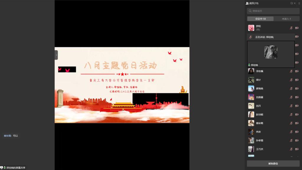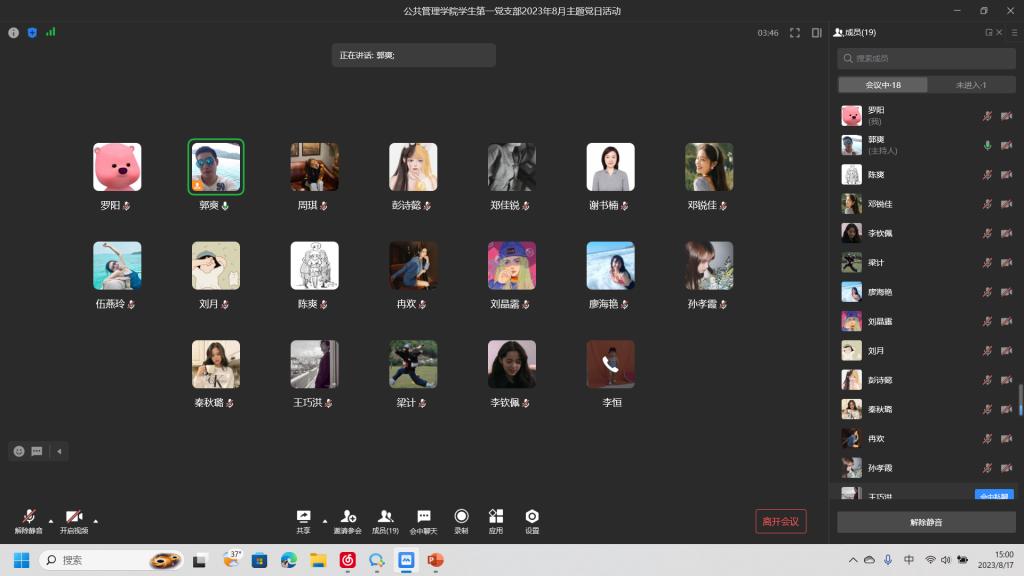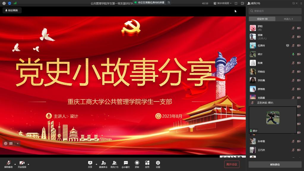 当前位置: 首页 >> 党建双创 >> 主题党日活动 >> 正文 BEATS员工第一党支部召开2023年8月主题党日活动 时间:2023年08月17日 18:49 来源:BEATS 2023年8月17日,BEATS员工第一党支部在企业微信以集中学习的方式开展了线上主题党日活动。本次活动由支部书记郭爽同志主持。 会议伊始,首先是由郑佳锐、罗阳、伍燕玲三位同志领学了《习近平总书记关于党的建设的重要思想》《习近平在上海合作组织成员国元首理事会第二十三次会议上的讲话(全文)》《习近平近日对防汛救灾工作作出的重要指示精神》《习近平在江苏考察时的重要讲话精神》《习近平向全球共享发展行动论坛首届高级别会议致贺信》等学习内容。而后,梁计同志分享了共和国元帅贺龙曲折的入党经历和革命女战士郭纲琳被捕之时一心向党、不屈不挠的故事,与会同志感慨万千,不禁重忆入党初心,更加坚定了理想信念。 最后,支部书记郭爽同志做了总结讲话。他指出,各位同志暑期在坚持学习理论知识的同时,也应当时刻关注国家时事和社会热点,并从中有所感悟和收获。另外,开学将至,希望各位同志积极落实新学期发展新同志的相关工作,为壮大支部队伍贡献力量。 上一条:BEATS员工第一党支部召开2022级积极分子集中谈心谈话座谈会 下一条:BEATS员工第一党支部召开2023年7月主题党日活动 【关闭】