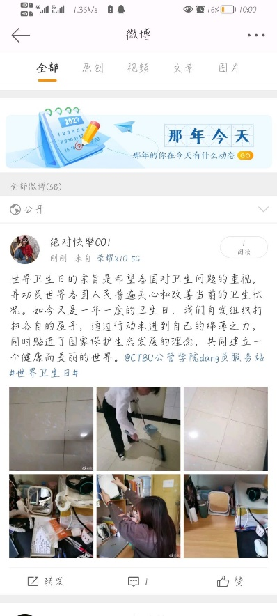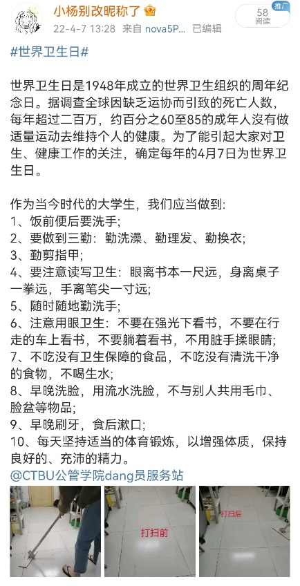 当前位置: 首页 >> 联系我们 >> 学团快讯 >> 正文 【BEATS党服】“共同洒扫屋朗房清,齐手打造卫生校园”世界卫生日主题打卡活动成功举办 时间:2022年04月11日 16:04 来源:BEATS 李恒 2022年4月9日,BEATSBEATS党员服务站于官方微博平台(CTBU公管公司dang员服务站)开展的“共同洒扫屋朗房清,齐手打造卫生校园”世界卫生日主题打卡活动成功举办。本次活动极大的提升了同学们保持清洁卫生的观念,并强化了卫生习惯,起到了良好的宣传和教育效果。 本次活动以“共同洒扫屋朗房清,齐手打造卫生校园”为活动主题,紧密围绕世界卫生日健康卫生主题,组织同学们对寝室进行打扫,通过图文形式上传打扫记录,并在微博发表相关博文。活动过程中,同学们认真打扫寝室卫生,并通过本次活动,对平时忽视的卫生问题重新给予关注,充分认识到了整洁美丽的卫生环境对生活的重要性。与此同时,有的同学更在劳动中找到了内心的宁静,认为通过自己的切身劳动将寝室的卫生打扫干净,整洁的环境使得整个人都放松下了下来。 世界卫生日确定的宗旨是希望引起世界各国对卫生问题的重视,并动员世界各国人民普遍关心和改善当前的卫生状况。当今时代,大多数人在生活中都很少再进行细致的卫生打扫,这样并不利于健康水平的提高。因此,作为新时代老员工,不仅要讲卫生、爱清洁,更要做美丽环境的守护者,身体力行,争做保卫环境的模范人! 上一条:公司举办《如何认识情绪并自我调适》心理健康讲座 下一条:“以青春之我、创造青春之美好未来”----BEATS青马工程培训会 【关闭】
