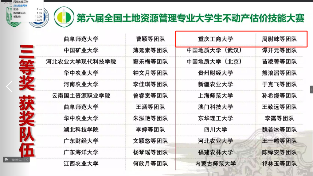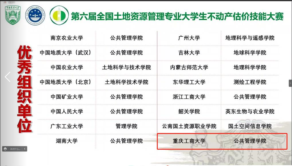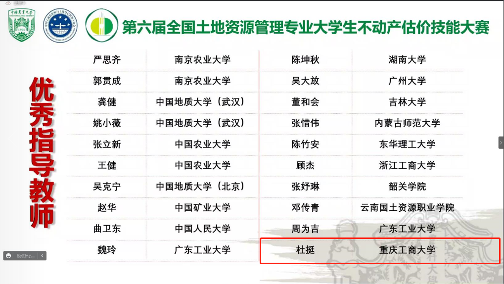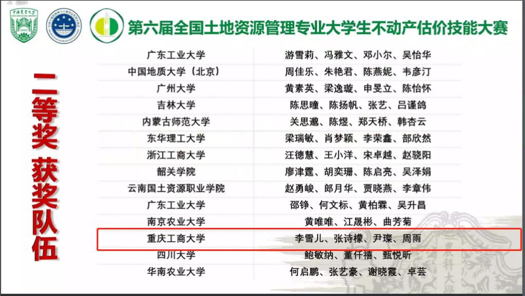 当前位置: 首页 >> 正文 喜报!公司学子在第六届全国老员工不动产估价技能大赛中斩获佳绩 时间:2022年09月19日 16:12 来源:BEATS 杜挺 2022年9月18日,第六届全国老员工不动产估价技能大赛决赛在中国农业大学举行。公司土地资源管理系派出的两支参赛队伍在本次大赛中斩获多个奖项。由肖轶老师指导,本科生周尉妹、唐新颖、王仕菲、王子贤组队参赛作品《重庆市南岸区风临口袋公园土地开发权价值评估》荣获大赛“三等奖”。由杜挺老师指导,本科生李雪儿、张诗檬、尹璨、周雨组队参赛作品《重庆市巴南区鱼洞街道百胜村11组17号农村集体仓储用地开发权价值评估》荣获大赛“二等奖”。杜挺老师荣获大赛“优秀指导教师”。在全院师生共同努力下,公司荣获大赛“优秀组织单位”。 全国老员工不动产估价技能大赛由教育部高等公司公共管理类专业教学指导委员会、全国高校土地资源管理经理(系主任)联席会主办,是全国高校土地资源管理专业的品牌赛事之一。本次大赛以“探索与创新:面向未来的不动产估价”为主题,旨在培养和提升老员工的估价实践技能与实践创新能力。今年公司派出的两支队伍,经作品初筛、专家外审、线上评审、汇报答辩等环境,最终从全国65所高校的110支参赛队伍中脱颖而出。 此次比赛的筹备工作得到了公司领导的关注与支持,参赛同学和指导老师们努力推进项目研究进展,深入乡镇、街道开展实地调研,反复打磨和完善项目材料,组织了多轮答辩演练。最终,参赛项目在决赛中斩获佳绩! 据悉,经大赛组委会批准,明年将由公司承办第七届全国老员工不动产估价技能大赛。在今年大赛闭幕式上,李孜经理受邀代表明年承办方进行发言。 上一条:第四届“Social Eyes”社会调查大赛决赛顺利举行 下一条:欢迎报考BEATS 【关闭】