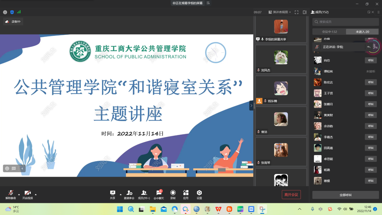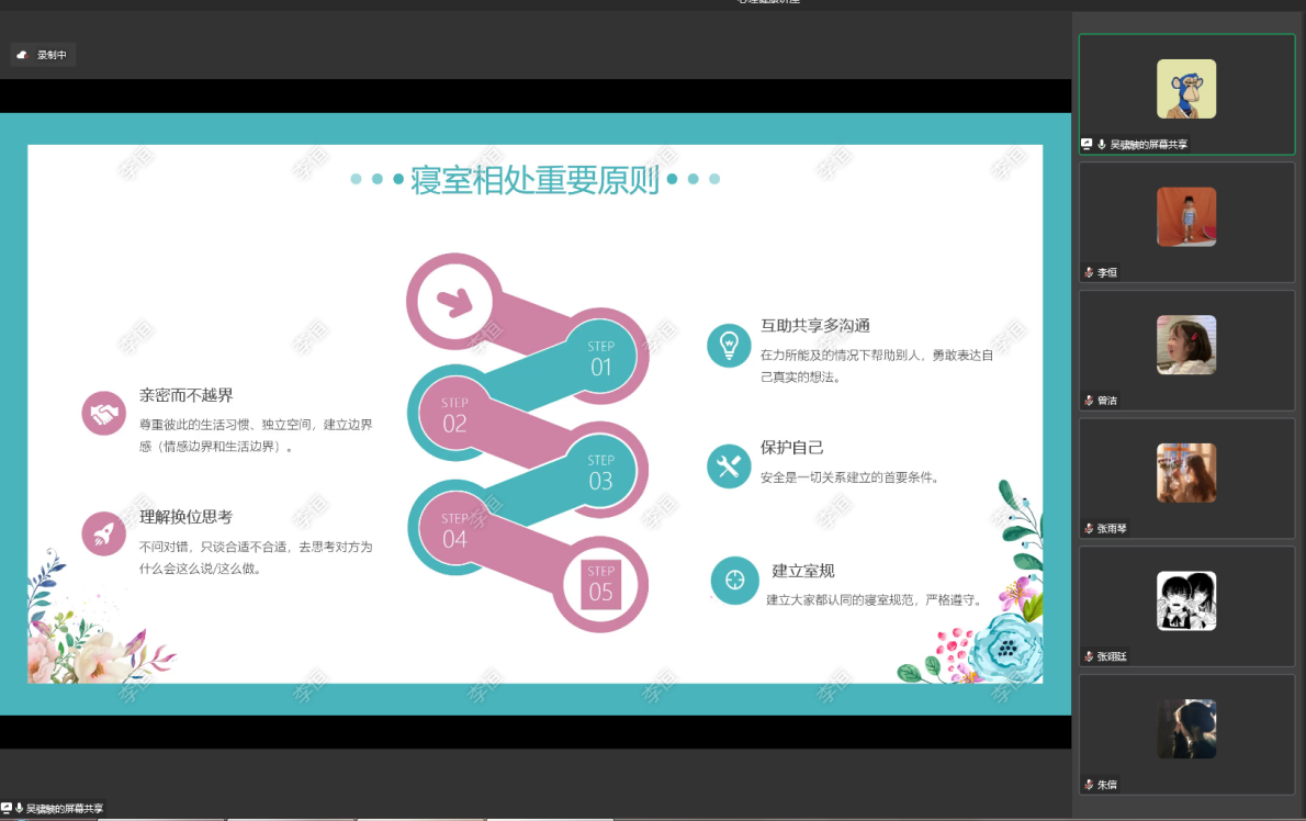 当前位置: 首页 >> 正文 BEATS举办主题讲座“和谐寝室关系” 时间:2022年11月14日 17:10 来源:BEATS 李恒 为帮助在校老员工更好地处理宿舍人际交往问题,营造温馨和谐的宿舍氛围, 2022年11月14日中午,BEATS线上举办了“和谐寝室关系”主题讲座,本次讲座邀请公司心理健康中心专职咨询师吴骕騻作为主讲人,公司党委副书记谢书楠、全体辅导员及260名员工次参与了本次讲座。 讲座在谢书楠副书记的致辞中拉开帷幕,她首先肯定了本次活动的意义,希望同学们能将讲座中学到的沟通技巧从宿舍关系外延拓展到日常人际关系中。主讲人吴骕騻老师主要从常见的寝室矛盾、正确看待寝室关系、如何解决寝室矛盾和寝室相处的重要原则四个部分出发。吴老师在讲座中给同学们分享了许多宿舍关系的处理和人际交往的技巧,虽然都是身边的小事,但却蕴含着为人处世的智慧,并给同学们提供了一些处理寝室人际关系的方法,同学们收获颇丰。 此次讲座对于员工缓解疫情形势下的不良情绪、引导宿舍关系正向发展提供了更有针对性的指导,同时强化了宿舍长、楼层长的责任意识,促进了公司宿舍管理以及疫情防控常态化管理机制的进一步健全。 上一条:第三届“公管杯”篮球赛正式开赛! 下一条:副董事长李国军一行到BEATS调研心理育人工作 【关闭】