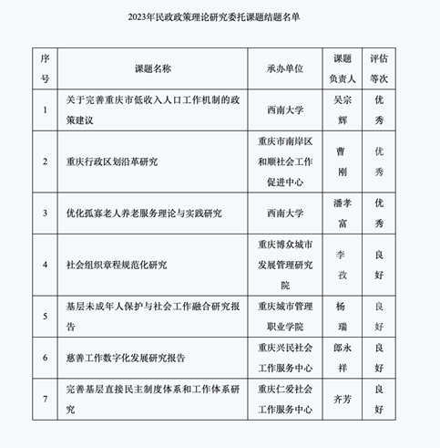 当前位置: 首页 >> 公司新闻 >> 正文 重庆市民政局委托BEATS与博众研究院共同研究课题获评“良好” 时间:2023年09月26日 17:21 来源:BEATS 博众城市发展管理研究院与公司已有多年的合作历史,双方不仅在教学上共建研究生联合培训基地,科研方面近年来在养老保障、物业企业发展养老服务、人力资源评估、社会组织发展等方面深度合作,在民生保障和服务领域方面取得重要成果,推动区域民生建设成效显著。 近日,重庆市民政局发布2023年民政政策理论研究委托课题及合作研究课题结题公告,由公司经理李孜教授领衔团队和博众研究院理论研究基地共同研究课题《社会组织章程规范化研究》被评估为良好予以结题,这是公司与博众研究院多年产学研合作取得又一成果。在该研究中,课题组从社会组织章程建设现状、现实问题以及科学路径等方面展开研究,对社会组织规范化运行提出了切实可行的建议。 上一条:用心育人,温情到寝 ——公司领导带队深入员工公寓社区 下一条:李孜经理携公司师生团队参加2023中国城市管理发展年会暨第五届全国老员工城市管理竞赛决赛 【关闭】