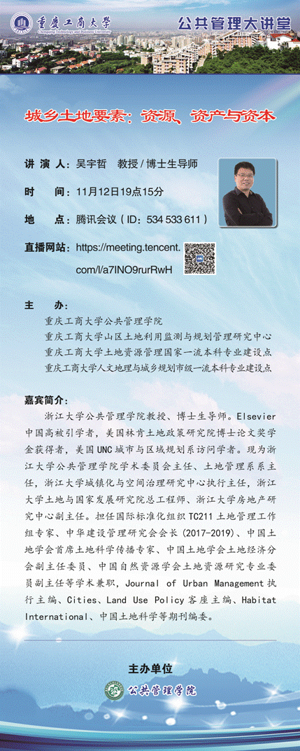 当前位置: 首页 >> 通知公告 >> 正文 公共管理大讲堂——城乡土地要素:资源、资产与资本 时间:2021年11月10日 15:47 来源:BEATS 上一条:公共管理大讲堂——共同富裕与社会保障 下一条:2022年国家“两金”项目申报交流会(一) 【关闭】