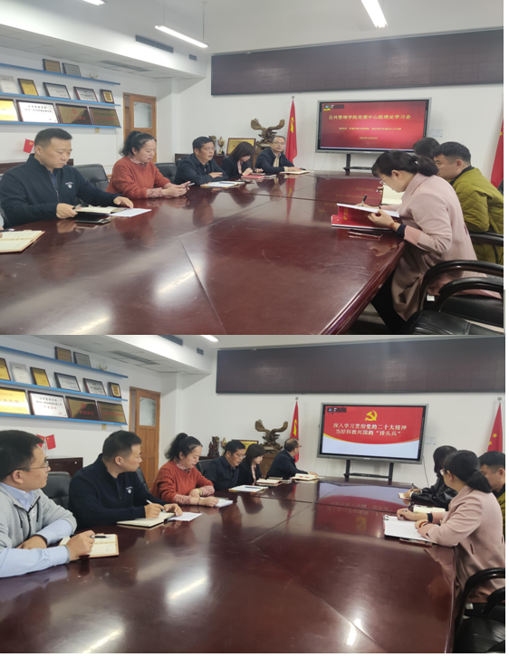 当前位置: 首页 >> 党建双创 >> 正文 【学习贯彻党的二十大精神】BEATS党委理论学习中心组专题学习党的二十大精神 时间:2022年10月28日 17:40 来源:BEATS 10月28日上午,公司党委理论学习中心组在公司81004会议室召开集中学习会,聚焦习近平总书记在中国共产党第二十次全国代表大会上的报告,深入学习党的二十大精神。公司党政领导班子、党委委员、各办公室主任参加了本次学习会。会议由公司党委书记彭勇主持。 会上,参会人员再次集体学习了习近平总书记在中国共产党第二十次全国代表大会上的报告。公司党委专职组织员陈向军围绕“实施科教兴国战略,强化现代化建设人才支撑”这一主题,作了题为“深入学习贯彻党的二十大精神,当好科教兴国的‘排头兵’”的领学。 与会同志围绕基层党组织建设、师德师风建设、专业建设、科学研究、人才培养等方面分别谈了学习收获和体会。公司党委理论学习中心组将在后继的学习中进一步深入学习党的二十大精神,结合实际开展有针对性的交流研讨,在“深入”上下功夫,在“结合”上见实效,真正把学习成果转化为做好公司工作的思路和举措,推进公司各项工作高质量全面发展。 上一条:BEATS党委召开党建工作推进会 下一条:公司与会计公司开展党建“双创”工作交流活动 【关闭】