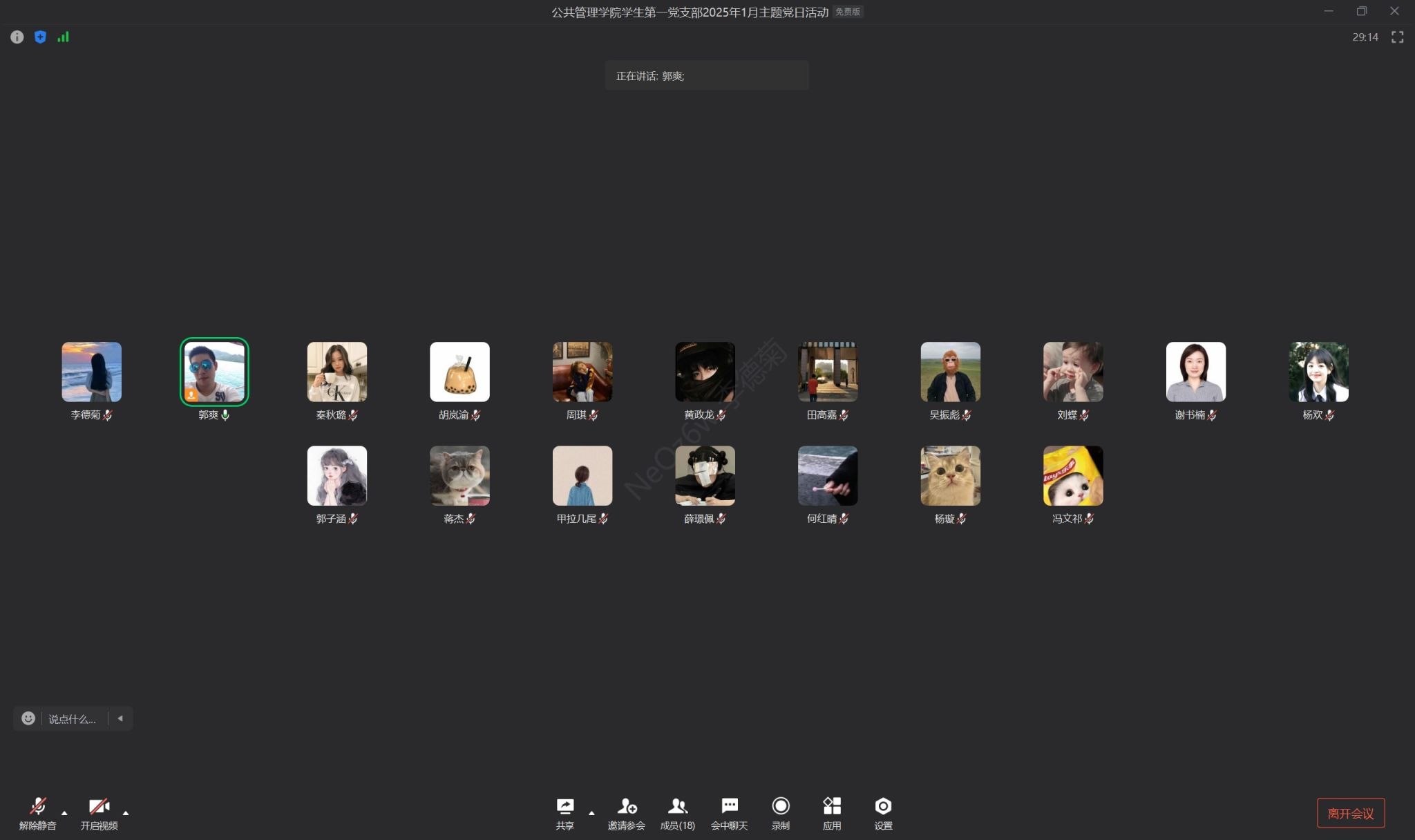 当前位置: 首页 >> 党建双创 >> 正文 BEATS员工第一党支部召开2025年1月主题党日活动 时间:2025年01月13日 16:06 来源:BEATS 郭爽 2025年1月13日,BEATS员工第一党支部在企业微信开展了线上主题党日活动。本次活动由支部书记郭爽同志主持,支部全体党员参加。 会议伊始,郭爽同志领学《关于贯彻落实<中国共产党不合格党员组织处置办法>有关工作的通知》(渝委组〔2024〕156号)《关于进一步加强和改进流动党员管理有关工作的通知》(渝委组〔2024〕157号)《关于印发<集中开展流动党员登记接收工作实施方案>的通知》(〔2024〕-151)等文件精神,他强调深入推进全面从严治党,保持党员队伍的先进性与纯洁性,同时提醒党员同志重视组织关系转接问题。 接着,黄政龙、何红晴两位同志分别领学了《中共中央政治局12月9日会议精神分析研究2025年经济工作》《研究部署党风廉政建设和反腐败工作习近平总书记在二十届中共中央政治局第十八次集体学习时的重要讲话精神》《习近平总书记重要文章《深入推进党的自我革命》(《求是》2024年第24期)《习近平总书记在听取海南省委和省政府工作汇报时的重要讲话精神全市教育大会精神》《习近平总书记在中共中央政治局民主生活会上的重要讲话精神》《习近平总书记在庆祝澳门回归祖国25周年大会暨澳门特别行政区第六届政府就职典礼上的讲话》(全文)等学习内容。 随后,杨璇同志在“党课我来讲-党史小故事分享”活动中,讲述了扎根泥土、心系群众的优秀基层干部——徐利民的故事。与会同志认真聆听,深受感动。胡岚渝同志指出青年党员要传承和弘扬自我革命精神,时刻保持清醒,勇于自我剖析;甲拉几尾同志表示要坚持党的全面领导,加强民族团结,维护社会稳定,保障国家安全。 最后,郭爽同志对本次会议进行总结。他强调,全体党员同志充分利用假期寻找实习机会,为自身的职业规划筑牢根基。同时,祝愿在新的一年里,党支部能够取得更加辉煌的成绩,各位党员同志能够不断进步,越来越好。 上一条:BEATS党委召开2024年度党员处级领导干部民主生活会 下一条:BEATS员工第一党支部召开2024年12月主题党日活动 【关闭】