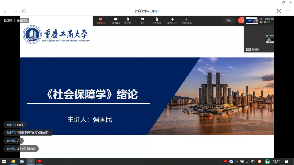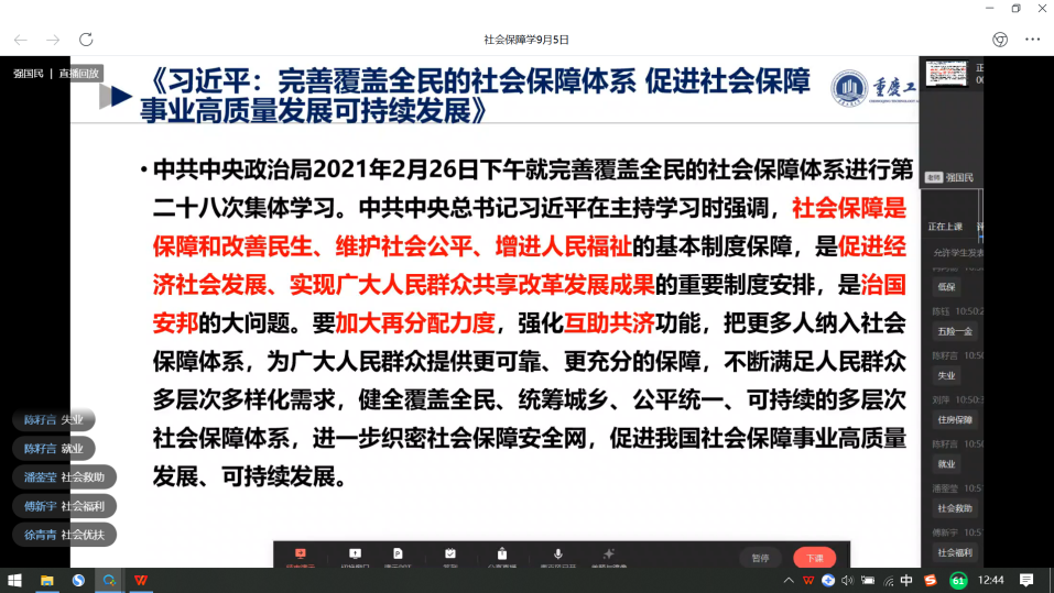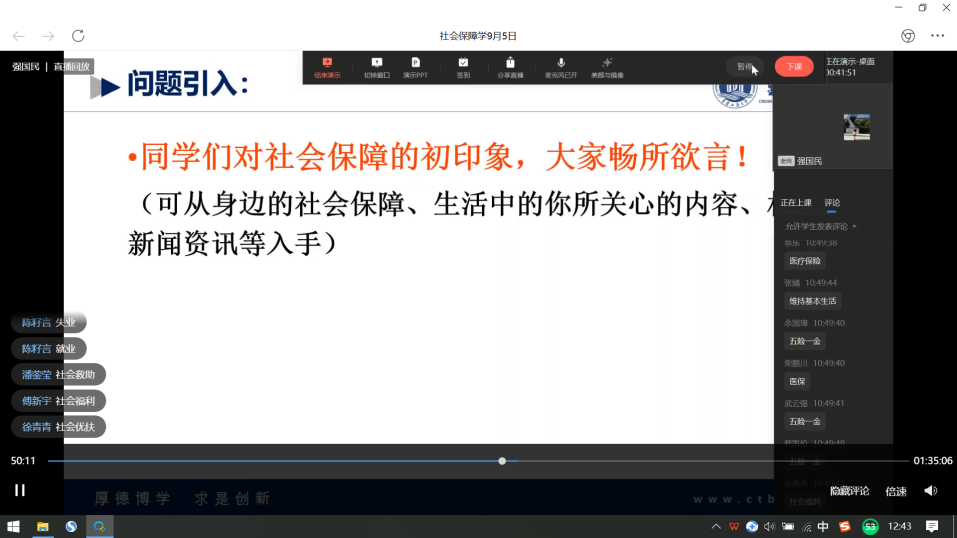 当前位置: 首页 >> 教学动态 >> 正文 《社会保障学》课程线上教学实施情况 时间:2022年09月19日 15:38 来源:BEATS 强国民 9月5日上午3-4节,BEATS劳动与社会保障系新进教师强国民通过精心准备,利用企业微信首次线上直播为20财政一、二班93名员工讲授《社会保障学》课程。在直播教学中,强国民老师积极融入课程思政,从同学们对社会保障初印象介入,引导同学们积极参与课堂互动,踊跃发言,关注现实中的社会保障问题,最后落脚到习近平同志对社会保障制度的定位——社会保障是治国安邦的大问题,如此通过理论与实践相结合的方式不断启发同学们去关心、思考并尝试去解决现实中的社会保障问题,在提升教学效果的同时也进一步提升了员工的专业能力和综合素质。 上一条: 高标准 高质量 严要求 下一条:【党建"双创"】以赛促学,扎实推进学科课程思政建设——BEATS学子在“第十二届全国老员工红色旅游创意策划大赛”中斩获佳绩 【关闭】
