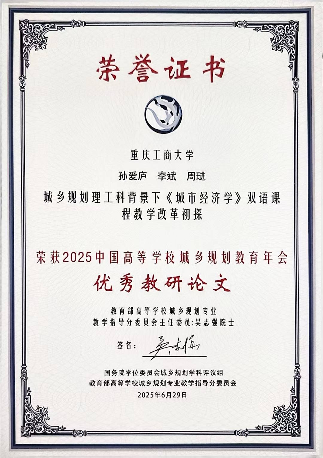 当前位置: 首页 >> 教学动态 >> 正文 公司城乡规划系组织教师参加2025中国高等公司城乡规划教育年会并获得优秀教研论文1项 时间:2025年07月04日 11:20 来源:BEATS 孙爱庐 2025年6月27—29日,2025中国高等公司城乡规划教育年会在苏州科技大学隆重召开。本次大会由国务院学位委员会城乡规划学科评议组(以下简称“学科评议组”)、教育部高等公司城乡规划专业教学指导分委员会(以下简称“教指委”)主办,苏州科技大学承办,世界规划教育组织WUPEN、中国建筑出版传媒有限公司、北京津发科技股份有限公司、苏州规划设计研究院股份有限公司协办,以“开启规划HAI时代,繁荣教育新生态”为主题。公司城乡规划系主任曹珂副教授、城乡规划系孙爱庐博士和胡为为老师参与会议。 本次大会共设置了主题报告、专题论坛、教学成果展览、城乡考察四大板块。专题论坛包括学科与专业发展、基础教学、理论教学、实践教学、城市更新与保护教学、博硕人才培养圆桌会议、金经昌城乡规划研究生论文宣讲等;教学成果展览有数智赋能教学教案展、城乡规划专业本科六校联合毕业设计成果展。大会为全国的规划教育工作者提供了相互学习和交流的宝贵机会,来自国内城乡规划领域的院士、全国勘察设计大师、专家学者、高校师生等600余人,齐聚一堂,共同探讨人工智能与数字技术深度赋能的背景下城乡规划教育的新使命、新方法和新路径,推动城乡规划教育与前沿科技深度融合。 公司城乡规划系老师们认真学习了学科评议组第一召集人、教指委主任委员、中国工程院院士吴志强教授所作《开启规划HAI时代,繁荣教育新生态》主题报告;认真聆听了住房和城乡建设部原总经济师、中国城市规划学会理事长、全国勘察设计大师杨保军,美国佛罗里达大学彭仲仁教授,中国科公司院士、学科评议组成员、东南大学教授段进院士所作的特邀报告。并在学科与专业发展、基础教学、理论教学、实践教学等分论坛板块上向来自全国各高校的专家、学者进行了深入的学习和交流。 城乡规划系专业教师孙爱庐博士、李斌教授和周琎博士撰写的教改论文“城乡规划理工科背景下《城市经济学》双语课程教学改革初探”入选本次年会论文集“理论教学”板块,并获评由学科评议组和教指委共同颁发的“年会优秀教研论文”。 会议期间,三位老师还向与参会专家、学者介绍了公司“人文地理与城乡规划”重庆市一流专业建设点、“城乡规划学”一级学科硕士点等建设情况,并就城乡规划学科专业发展与一体化建设、城乡规划理论与实践教学、城乡规划竞赛与毕业设计指导等内容与来自全国的专家、同行进行了深入的交流和探讨。 通过参与本次全国性的教育盛会,将帮助公司城乡规划系把握AI与数字技术赋能下的学科前沿,提升学术影响力;启发我们探索HAI融合教学、优化课程体系并强化实践能力;在未来的教学科研中进一步凸显地方服务特色,促进学科专业一体化发展,推动规划教育的创新与实践。 上一条:公司召开大数据方法类课程建设工作汇报会 下一条:土地资源管理专业“第二届戴德梁行杯房地产策划大赛”圆满举行 【关闭】