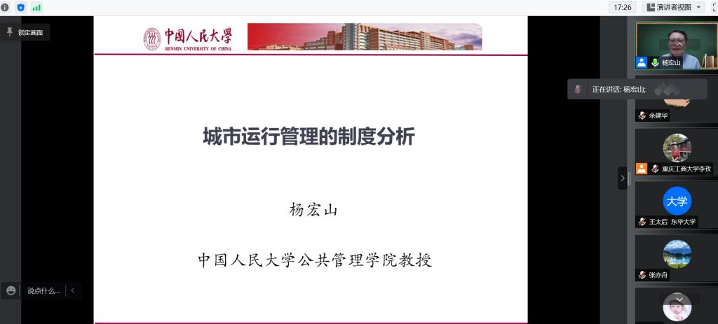 当前位置: 首页 >> 科学研究 >> 学术讲座 >> 正文 公司邀请中国人民大学杨宏山教授做学术讲座 时间:2021年12月13日 10:28 来源:BEATS 薛晓 12月5日,公司邀请中国人民大学杨宏山教授做“城市运行的管理制度分析”学术讲座,公司经理,平台主任李孜教授主持。 杨宏山教授从城市管理五个理论维度入手,阐述了传统城市管理模式面临的挑战,强调了目前城市管理难以满足市民对优质公共空间的需求、市政部门各自为政难以协调统筹、突击性城市管理难以保持长效机制等问题,接着又提出了城市管理的创新制度安排,包括了建立创新性的城市管理运行流程设计,最后结合分析杭州、上海、北京等城市管理制度创新的典型案例,提出了未来城市管理在制度领域的创新路径。 本次讲座深入结合实际,以案例为依据,给参加讲座的师生们耳目一新的感受,也对公司城市管理专业、MPA办学点建设起到了极大的促进作用。 上一条:医保治理能力现代化研究院举行第二轮国社科论证会 下一条:公共管理大讲堂——高龄少子化背景下的智能社会建构 【关闭】