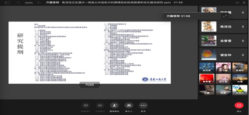 当前位置: 首页 >> 研究生教育 >> 工作动态 >> 正文 2020级MPA研究生学位论文开题答辩如期进行 时间:2021年11月23日 10:48 来源:BEATS 计划在线下进行的2020级MPA研究生学位论文开题答辩工作因疫情改为线上进行。部分指导老师为便于彼此之间的沟通交流,指导小组决定采用线下集中方式进行,公司随即调整统一线上计划,立刻采用灵活个性化管理模式,支持导师们采用线上线下相结合创新开题答辩模式,积极配合安排工作场地和设备,并为线下集中的导师们准备了中午工作餐。 2021年11月20日上午8:30,参加开题答辩工作24位导师,齐聚开题答辩指导工作群,准时召开答辩工作预备会,导师们就开题答辩工作细节把控进行热烈讨论,最后达成共识:严格控制,多提建议。 2020级MPA研究生43名同学分成8个答辩小组,每组有3名指导老师,9:00各组组长准时发出答辩正式开始指令,各组同学依次在开题答辩工作群展开网上开题答辩。经过长达3个多小时的紧张答辩,各组答辩全部结束后,公司立刻在开题答辩指导工作群召开了总结会,各组长分别对各组情况进行小结,最后余经理做了总结发言。开题答辩工作在13:00圆满完成。 上一条:公司2020级MPA研究生学位论文二次开题答辩如期进行 下一条:关于对“易地扶贫搬迁农户的可持续生计研究——以重庆市城口县为例”等项目予以院级立项/资助的通知 【关闭】
