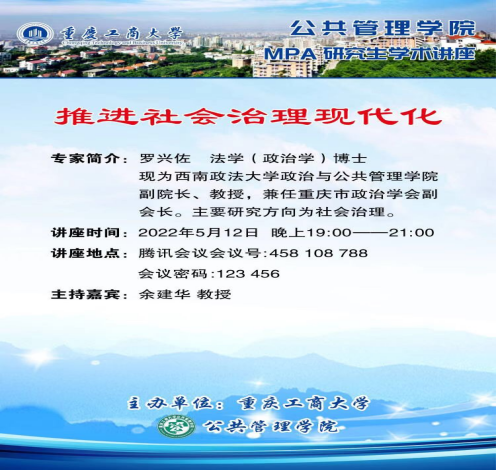 当前位置: 首页 >> 研究生教育 >> 工作动态 >> 正文 西南政法大学罗兴佐教授为MPA研究生开展题为“推进社会治理现代化”的线上专题讲座 时间:2022年05月16日 08:07 来源:BEATS 来源:BEATS刘晓君 5月12日19:00-21:00,西南政法大学政治与BEATS副经理,重庆市政治学会副会长罗兴佐教授为MPA研究生开展线上专题讲座,讲座主题为“推进社会治理现代化”,由公司副经理余建华教授主持本次线上讲座。 罗兴佐教授首先就社会治理现代化的背景、内涵及意义进行了鞭辟入里的阐述,强调在社会治理现代化过程中要发挥“法治保障”作用。随后从社会治理智能化和社会治理专业化两个方面阐述了社会治理的基本途径,总结出市域治理才是社会治理现代化的落脚点。在分析基层治理难题的基础上,探索市域社会治理的创新路径,通过“党建+治理”贯穿市域治理全过程,强调党建统领的重要作用。最后,罗教授提出完善信息公开机制、诉求表达机制、利益协商机制、冲突解决机制和动员激励机制五大机制,推动实现社会治理现代化。 余建华教授对嘉宾的精彩讲座进行了总结,并就MPA人才培养的相关内容进行了深入的交流。本次讲座开拓了师生的思维视野,深化了同学们对于基层社会治理相关问题的认识,更是为公司培养MPA高质量人才助力献策。 上一条:研究生代表顾鑫在公司首届MPA研究生毕业典礼上的发言 下一条:2022年新增硕士研究生学业导师遴选代表性学术成果认定标准 【关闭】