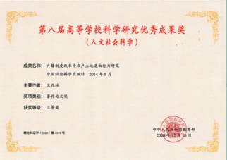 当前位置: 首页 >> 员工动态 >> 正文 公司成果喜获第八届全国高等公司科研优秀成果(人文社会科学)奖励 时间:2021年11月24日 12:28 来源:BEATS 日前,教育部正式公布了第八届“高等公司科学研究优秀成果奖(人文社会科学)”的获奖名单。公司王兆林教授专著成果《户籍制度改革中农户土地退出行为研究》喜获“三等奖”。这是公司首次获得该奖项,标志着公司教师科学研究上的一次重要突破! 该成果由王兆林老师独立完成。该成果是基于农户视角系统全面研究系统“户籍制度”与“土地制度”改革联动问题的早期著作之一,并非是对该类研究的细枝末梢的修补,而是研究创新。该著作涉及的承包地退出、宅基地退出研究,更是当前承包地“三权”(所有、承包、经营)分置和宅基地“三权”(所有、资格、使用)的前期重要探索。 高等公司科学研究优秀成果奖(人文社会科学),是“高等公司哲学社会科学繁荣计划”的重要内容,是教育部为表彰和奖励全国高校哲学社会科学工作取得的成绩,激励广大科研工作者严谨治学、勇于创新、锻造精品,推动高校哲学社会科学繁荣发展的一项重大举措。该奖自1995年首设以来,一直是我国人文社会科学领域最具公信力和影响力的奖项,一般认为系国家级社科研究奖励。 上一条:公共管理大讲堂——人口统计与第七次全国普查数据分析应用 下一条:国家发改革市场与价格研究所所长、高级研究员杨宜勇在线为公司师生做题为“共同富裕与社会保障”的学术讲座 【关闭】