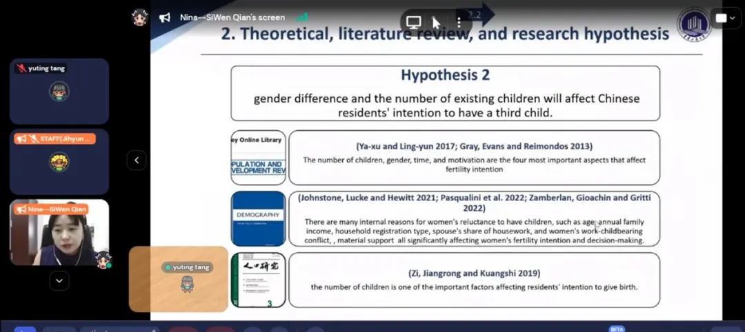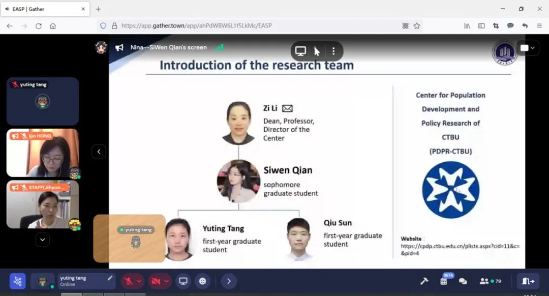 当前位置: 首页 >> 员工动态 >> 正文 公司李孜教授团队以文赴会参加第18届EASP年度会议 时间:2022年08月28日 18:48 来源:BEATS 钱思汶 2022年6月24日,第十八届东亚社会政策年度会议(18th East Asian Social Policy conference)于Gather Town平台线上举行。中心主任李孜教授与硕士生钱思汶等的论文《The Influence of COVID-19 on intention of third-child in China》受邀做大会主题发言。 东亚社会政策(EASP)研究网络是东亚及其他地区的学者、研究人员、员工和社会政策从业者的区域协会。EASP成立于2005年1月,旨在促进社会政策分析师之间的研究交流与合作,并为东亚社会政策作为一门学科的发展提供论坛和交流平台。本次ESAP会议由东亚社会政策研究中心、韩国卫生与社会事务研究所以及韩国延世大学共同主办。第18届ESAP会议主题为:TRANSFORMATION OF POST-COVID WELFARE STATES IN EAST ASIA: BEYOND PRODUCTIVIST WELFARE CAPITALISM?(东亚后疫情时代福利国家的转型:超越生产力的福利资本主义?)探讨新冠疫情下严格的社会疏离是否加剧了社会孤独感和孤立感、东亚国家真正改变了多少?是否有任何显着和显着的社会政策变化?以及疫情背景下社会政策在不同的社会产生不同的结果。 会上,平台主任李孜教授团队受邀分享了论文《The Influence of COVID-19 on intention of third-child in China》论文。基于中心所做的《数字化时代婚育行为调查》回收数据展开实证分析,探讨了在生育意愿持续低迷的严峻背景下,新型冠状病毒肺炎对我国居民三孩生育意愿的影响因素研究。研究发现性别和现有孩次数会显著影响居民三孩生育意愿,且新冠疫情对我国居民的三孩生育意愿具有显著抑制影响。并在此基础上提出几点展望,以求为后疫情时代相关研究提供参考。 上一条:公司青年教师方浩参加2022年第二届信息管理国际会议(WSIM 2022)并作主题报告 下一条:公司青年教师孙爱庐参加成渝双城经济圈建筑与土木大类高校青年教师学术论坛并作主题报告 【关闭】