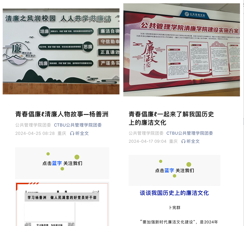 当前位置: 首页 >> 清廉公管 >> 正文 BEATS坚持“三廉”机制推动清廉之风启智润心 时间:2024年06月14日 09:53 来源:BEATS 谢书楠、刘乂萌 BEATS党委认真学习贯彻习近平新时代中国特色社会主义思想,以党纪学习教育为契机,深入学习习近平总书记关于党的建设的重要思想和全面从严治党、党风廉政建设、廉洁文化建设的重要论述,在公司党委的坚强领导下,以党纪为纲,筑牢廉洁之基,将廉洁的思想理念、价值取向、精神追求贯穿于办学治院和立德树人全过程,坚持一个统领、围绕两个阵地、聚焦三个群体,构建“培廉”“思廉”“践廉”机制,不断推动公司党风清朗、政风清明、师风清淳、教风清正、学风清新,努力营造风清气正的廉洁文化氛围。 一、坚持一个统领,凝聚合力,构建“培廉”机制,培育崇廉尚洁的新风正气 公司坚持把党的政治建设摆在首位,以政治建设为统领全面加强党的建设,全面贯彻党的教育方针,根据上级及公司有关文件精神要求,一是制订了《BEATS清廉建设实施方案》,构建了公司党委统一领导、纪委组织协调、科室各司其职、全体师生共同参与的“培廉”工作机制,制定《BEATS清廉公司建设2024年工作推进表》,对公司工作目标任务、工作进度、具体举措、责任要求进行全方位监督与全过程跟进。二是把习近平总书记关于全面加强党的纪律建设的重要论述纳入理论学习中心组学习内容,把执行廉洁纪律情况作为民主生活会和组织生活会的重要内容,确保廉洁文化建设的政治方向和舆论导向正确。三是公司纪委把清廉公司建设作为“三不腐”一体推进的重要举措,积极发挥组织协调作用,运用“一台账、两清单、双责任、双问责”监督机制,通过督导、约谈、支部共建等形式,推动高质量完成各项任务。四是各系部从人才培养的角度深入思考廉洁文化建设,把廉洁文化建设融入教书育人各领域、全过程,提升廉洁教育针对性、感染力。 二、围绕两个阵地,树正守明,营造“思廉”氛围,夯实清正廉洁思想根基 一是加强线下宣传阵地建设,打造廉洁文化墙。在公司办公室区域打造廉洁文化宣传专栏,在公司员工社区—共学社区楼层建设廉洁文化墙,让廉洁文化入眼入脑入心入行,营造出风清气正的廉洁文化氛围,引导全体师生培养积极向上的道德情操,让师生在工作、学习、生活之余眼前出现廉政文化图片,胸中常怀廉洁自律之心,自觉筑牢心中的廉洁“阵地”。二是加强网络阵地建设,营造廉洁文化氛围。在公司网站开辟“清廉公管”专栏,针对清廉公司建设的相关活动进行专题报道;在公司微信公众号开辟“青春倡廉”专栏,推送员工廉洁文化作品,定期发布廉洁故事、廉洁人物等相关内容;推动廉洁意识内化于心、外化于行。 三、聚焦三个群体,精准滴灌,开展“践廉”活动,涵养新时代校园廉洁文化 一是聚焦“关键少数”,把廉洁教育与干部教育相结合。突出抓早抓小,公司纪委对新任职的支部书记、系部主任进行廉政谈话,聚焦人、财、物重点岗位主要负责人开展“一对一”谈话,组织观看警示教育片,常态化开展纪律警示教育;组织党员干部和重点岗位负责人赴大圆祥博物馆家风建设基地等地开展现场学习,在实践中形成廉洁自律意识;每月给党员领导干部发送廉洁自律提示信息,教育引导其发挥廉洁奉公“头雁”作用,引导党员干部以身作则,奋发有为,成为师生的楷模,发挥领导干部在廉政教育中的模范示范作用。 二是聚焦教师群体,把廉洁教育与师德师风建设相结合。公司坚持把师德师风建设要求贯穿教师管理全过程,常态化开展师德师风警示教育,组织学习教育系统警示教育案例,观看师德师风警示教育片,全面提升教师政治素养、师德涵养。给党员老师们发放《纪律的温度:36个廉洁微故事》廉洁书籍,教育引导教师涵养克己奉公、清廉自守的精神境界。全体教师签订《“廉洁从教、奉献教育”的承诺书》,提升教师的师德修养水平,促进其廉洁从教,爱岗敬业,为人师表;引导广大教师坚定理想信念、陶冶道德情操、涵养扎实学识、勤修仁爱之心、坚守三尺讲台、潜心教书育人。 三是聚焦青年员工,把廉洁教育与第一二三课堂相结合。公司紧紧围绕立德树人根本任务,把清廉公司建设纳入员工的第一二三课堂,融入员工成长发展全过程。一是把廉洁警示教育内容纳入员工支部“三会一课”、主题党日、“青马工程”、团干部培训必修课;二是开展廉洁思政“四课”行动,即新发展党员入党廉洁“第一课”,毕业生离校“最后一课”,员工党员干部“廉洁党课”和辅导员“廉洁班课”的思政“四课”行动,分层分类开展纪律教育。三是在22级土管专业持续推进免监考诚信教育活动,强化员工知廉敬廉践廉行为养成。四是通过开展“以廉为荣、以贪为耻”手抄报比赛,廉政人物故事我来讲、“青春路 廉相伴”主题团日活动等,多维度、多形式、多渠道丰富廉洁文化供给,加强青年廉洁教育,夯实廉洁思想根基。 上一条:BEATS开展“守好廉洁心 筑牢廉洁线”主题党日活动 下一条:BEATS开展深化党纪学习教育 传承涵养清廉家风活动 【关闭】